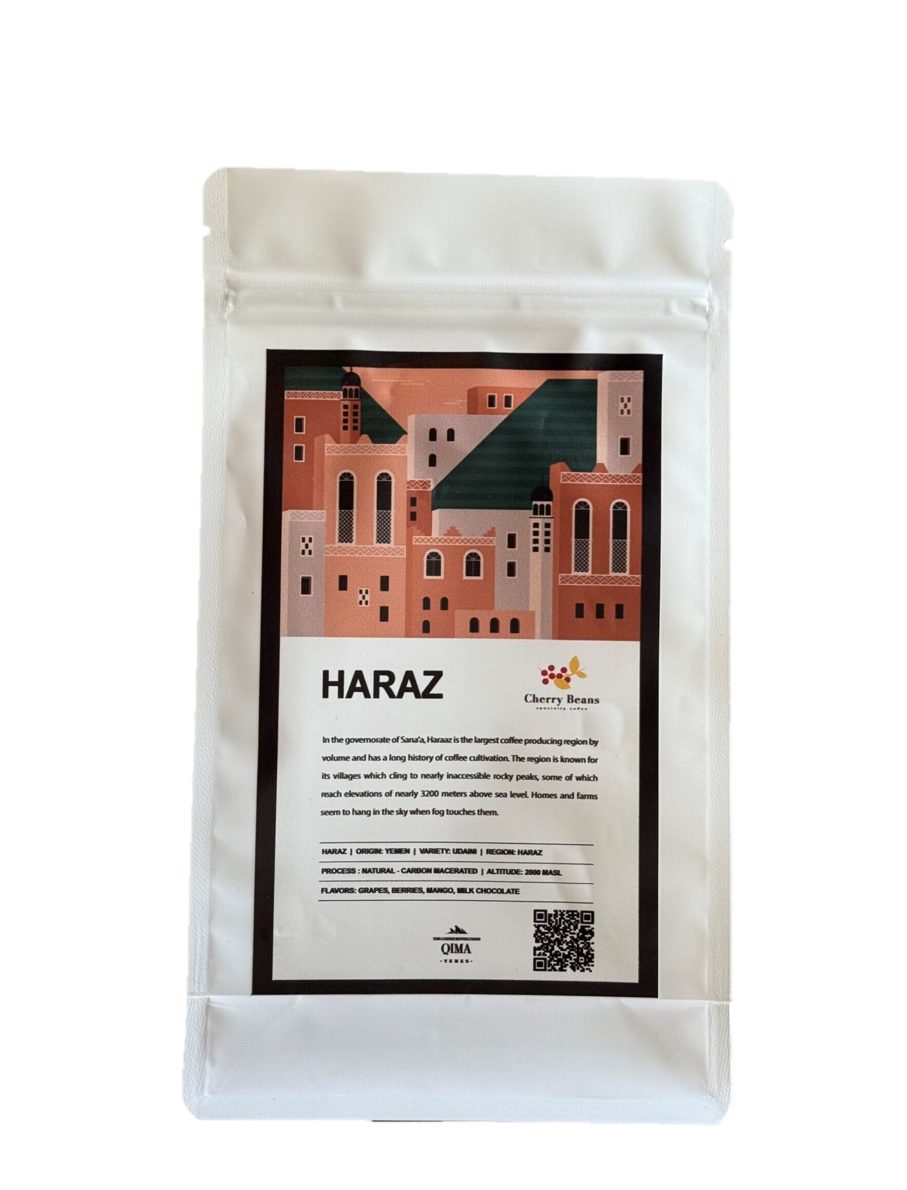 In the governorate of Sana’a, Haraaz is the largest coffee producing region by volume and has a long history of coffee cultivation. The region is known for its villages which cling to nearly inaccessible rocky peaks, some of which reach elevations of nearly 3200 meters above sea level. Homes and farms seem to hang in the sky when fog touches them.